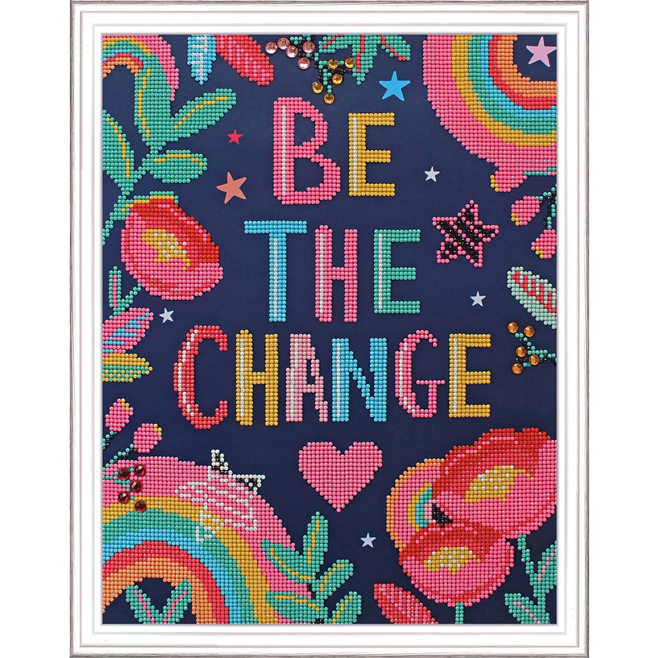 • This diamond painting design features the words “Be the Change” surrounded by rainbows, hearts, stars, and flowers in vibrant colors on a navy background.