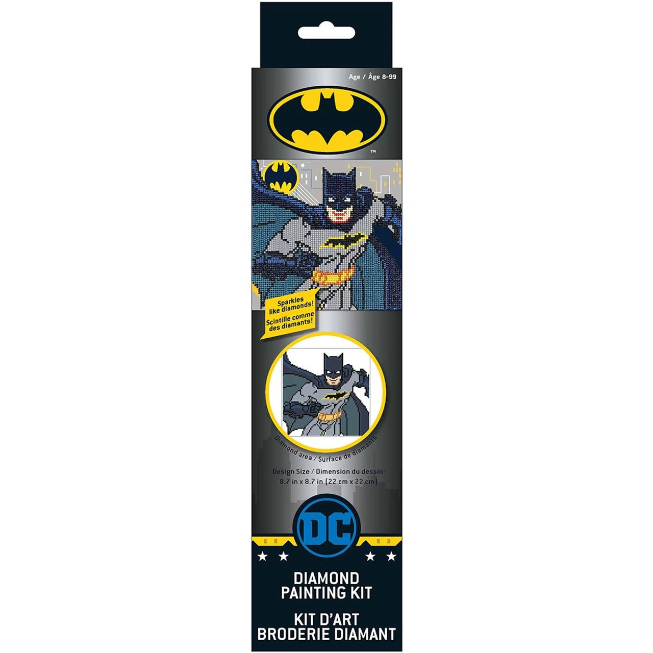 This diamond painting design features a portrait of Batman in action running through the streets of Gotham City as the bat signal lights up the sky. This striking image of the popular DC Comics superhero makes a great project for Batman fans of all ages! Fun and easy diamond paintings are created by arranging sparkling gems on a pre-printed canvas, resulting in eye-catching wall art with a dazzling sparkle. Diamond painting kit includes high-quality color-printed fabric, pre-sorted round gems, craft tray, stylus, soft grip, wax, and easy instructions. 8¾ x 8¾” (22.2 x 22.2cm).
