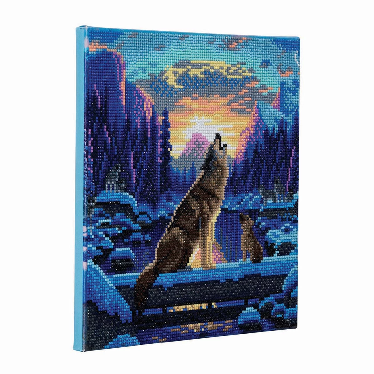 This diamond painting design features a beautiful view of a wolf pack at sunset. One wolf sits center stage with its cub, both howling at the rising moon as they sit on a fallen log across the icy stream. The rest of the wolf pack can be seen in the distance, peeking out from the trees in this mountain landscape. Fun and easy diamond paintings are created by arranging sparkling gems on a pre-printed canvas, resulting in eye-catching wall art with a dazzling sparkle. Diamond painting kit includes adhesive canvas mounted on a wooden frame, pre-sorted crystals, double-sided pen, jelly wax, trays, bags, template, chart, and instructions. 12 x 12″ (30 x 30cm).