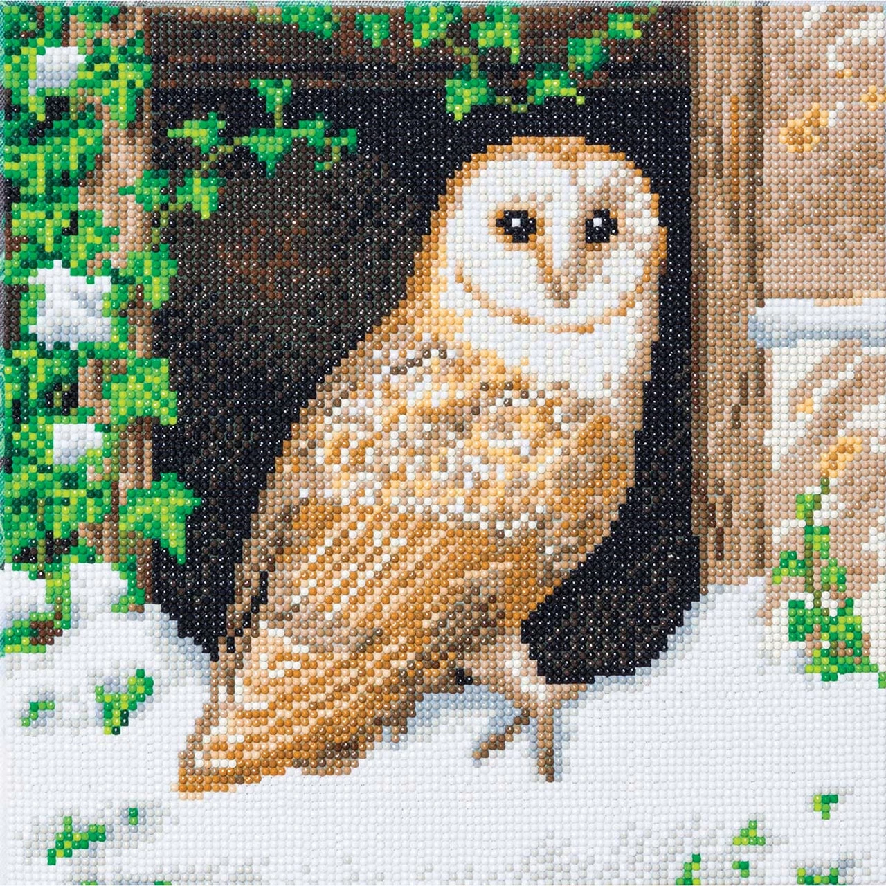 This diamond painting design features a snowy owl perched on the ground outside of a wooden barn framed by bright green leaves. A layer of snow makes the winter scene perfect for decorating all season long. Fun and easy diamond paintings are created by arranging sparkling gems on a pre-printed canvas, resulting in eye-catching wall art with a dazzling sparkle. Diamond painting kit includes adhesive canvas mounted on a wooden frame, pre-sorted crystals, double-sided pen, jelly wax, trays, bags, template, chart, and instructions. 12 x 12″ (30x 30cm).