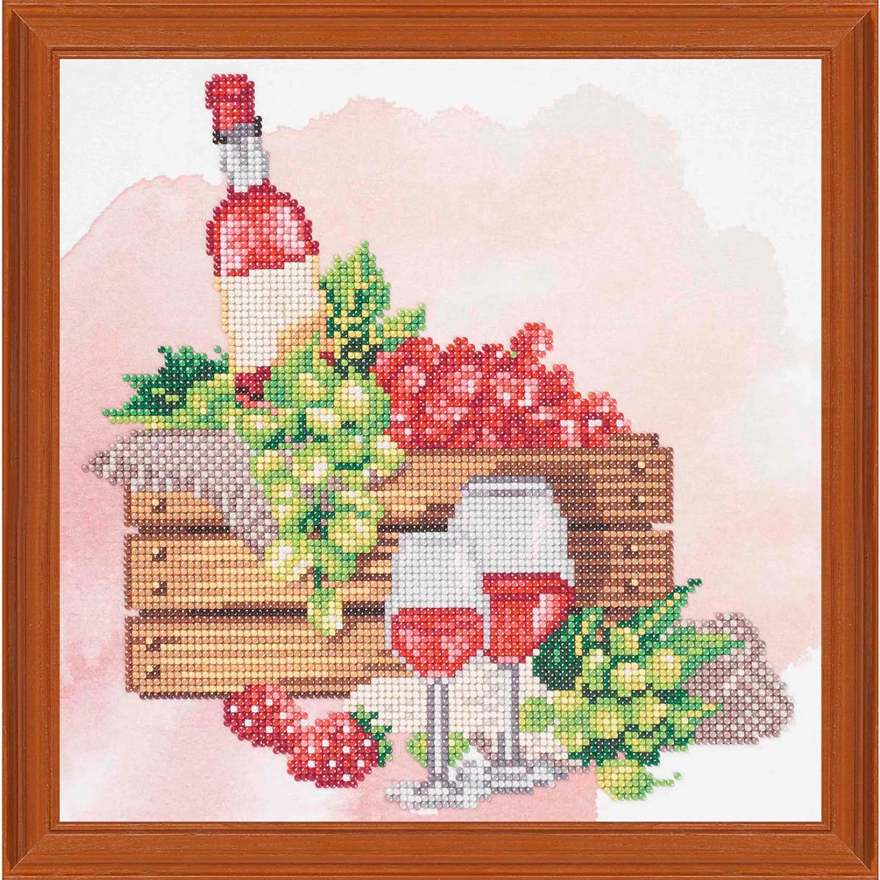 β’ This diamond painting design features a bottle of red wine and grapes in a crate with a pair of wine glasses and strawberries.