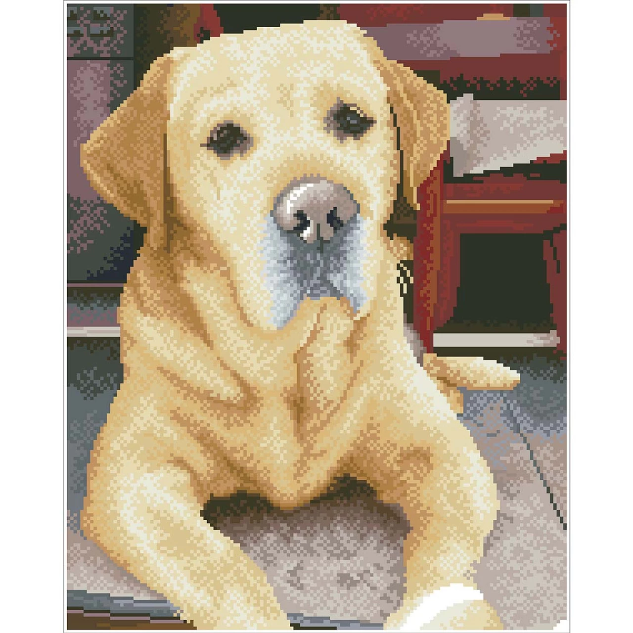β’ This diamond painting design features a yellow Labrador lying on the floor next to a table.